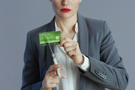 Closeup on woman employee in gray suit with credit card and scissors against gray background.