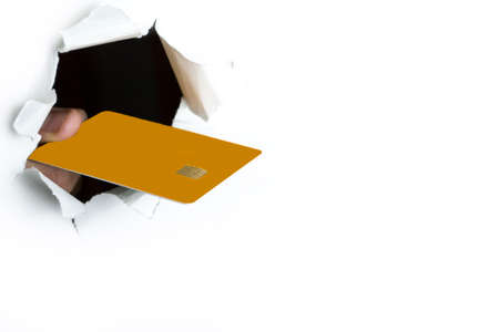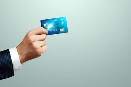 credit card online payments. personal finances and money management. hand holding bank card on white background.