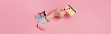 Cropped view of young woman holding credit card in pink background with hole, banner
