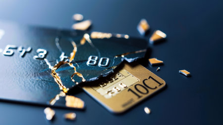 This captivating image showcases shattered credit card pieces on a dark surface, accompanied by sparkling debris and light reflections, illustrating financial loss.