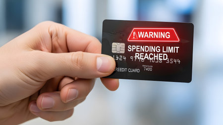 A hand holds a credit card with a red warning sign and text stating SPENDING LIMIT REACHED on...