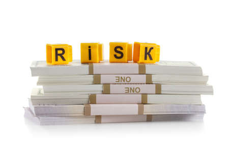 Concept investments risk, word made by letter blocks. Stack of money american hundred dollar bills