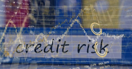 Image of financial data processing over credit risk writing. global finances, business and contactless payment concept digitally generated image.
