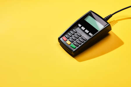Payment for purchases with credit card. Payment pos terminal top view