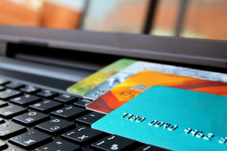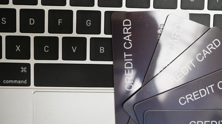 Close up image of laptop keyboard with several credit cards fanned out on top, suggesting online shopping or digital transactions