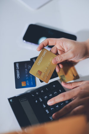 Asian accountant working, calculate and analyzing report project accounting with notebook and credit card in modern office, finance and business concept.