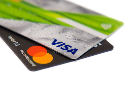Moscow, Russia - 27 august 2020: bank cards visa and mastercard isolated on white background. Online pay concept.