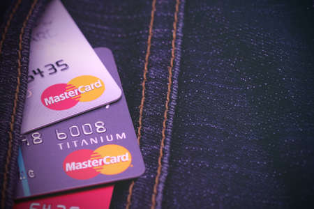 credit cards with Mastercard. Close up of many Mastercard credit cards. Plastic bank cards of Mastercard. International payment systems