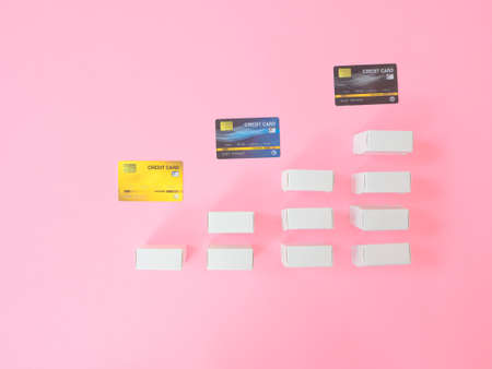 Marketing strategy or loan concepts from credit card and product box on pink background. Top view