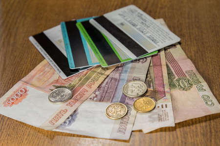 Russian cash paper and iron coins on wooden table. Economics and finance of Russian Federation. Sanctions and financial crisis. Accumulation of Russian people poverty and misery.