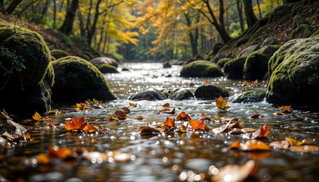 A tranquil autumn stream flows through a mossy forest, adorned with fallen leaves.