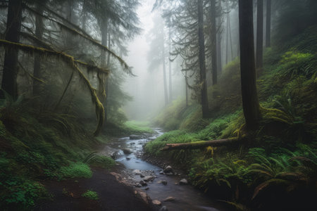 foggy forest with towering trees and brook running through it, created with generative ai
