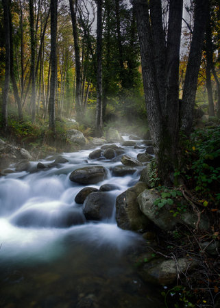 Misty autumn morning in an enchanted forest. A stream flows through moss-covered rocks.