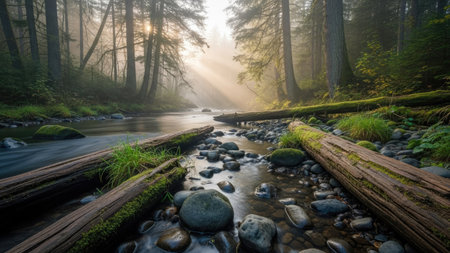 A serene landscape featuring a river winding through a dense forest. Sunlight filters through tall trees, illuminating the scene with a soft glow. Logs lie along the riverbanks, and the surrounding environment is lush and verdant. Suitable for various applications, including editorial and commercial projects.