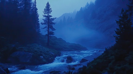 A serene scene showcasing a misty river meandering through a stunning blue-hued forest at dusk, highlighting the tranquility of nature's beauty.