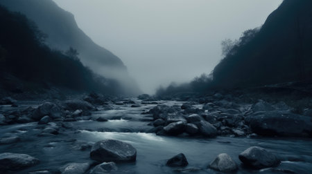 a photo of a misty nature scene with fog rolling over rocks, creating a pensive stillness. the dark turquoise tones add a touch of romance to the 8k resolution image. this swiss realism-inspired photo captures the essence of nature, showcasing a cabincore aesthetic in the serene riverscape. ai generated