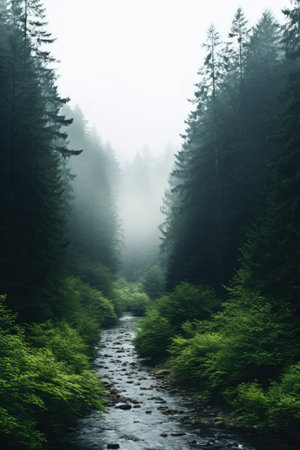 A serene forest scene featuring towering evergreen trees shrouded in mist, with a rocky stream winding through the landscape, evoking a sense of tranquility in nature.
