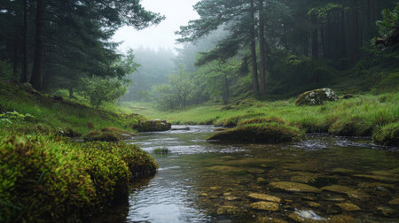 a green, slow-flowing stream meanders gracefully over moss-covered rocks, creating a serene and misty atmosphere. captured with a graflex speed graphic camera, this national geographic-style photo showcases the beauty of mountainous vistas. the realistic rendering of the landscape transports viewers into a photo-realistic world, reminiscent of forestpunk aesthetics. ai generated