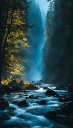 Mystical waterscape showcases serene river flowing through dense forest under soft light in enchanting natural setting