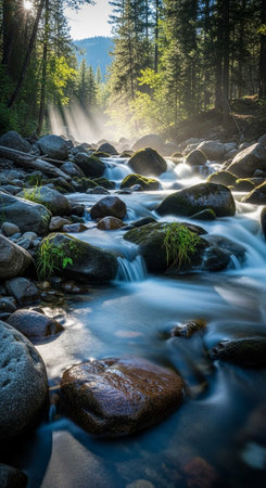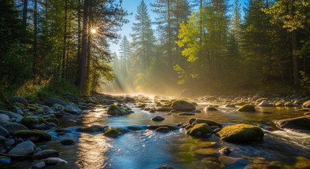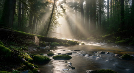 Sunbeams streaming through the lush forest illuminate a misty creek flowing gently over smooth rocks, creating a serene and tranquil scene