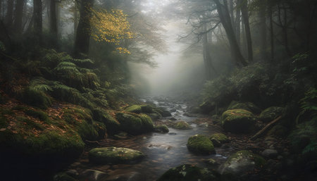 Tranquil scene foggy mountain, flowing water, dark forest, serene sunset generated by artificial intelligence