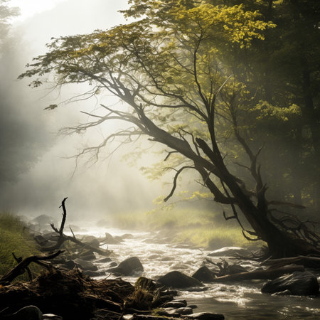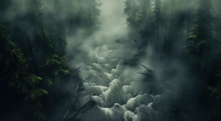 white mist envelops a serene stream flowing through a dense forest, creating an atmosphere reminiscent of dark, foreboding landscapes. this captivating photo captures the essence of environmental activism and the beauty of romantic riverscapes. the color palette of dark cyan and gray adds to the mysterious allure of this secluded setting. inspired by the vintage imagery of einar hkonarson, this photo is a visual treat