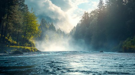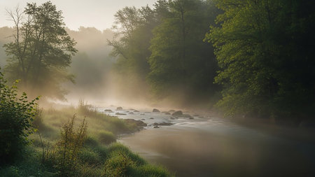 River showing misty river flowing through a lush green forest at dawn keywords: river, stream, water, nature, forest, trees, mist, fog, morning, dawn, sunrise, light, sunbeams, green, lush, vegetation, rocks, stones, flowing, serene, peaceful, tranquil, landscape, wilderness, outdoors, natural, environment, scenic, riparian, woodland, natural beauty description: a serene river flows gently through a dense, green forest shrouded in morning mist. sunbeams pierce the fog, illuminating the water...