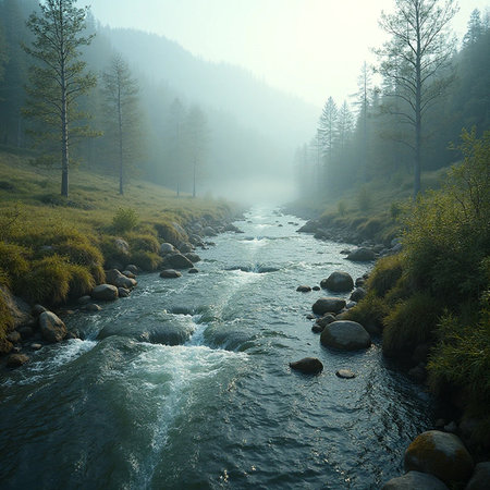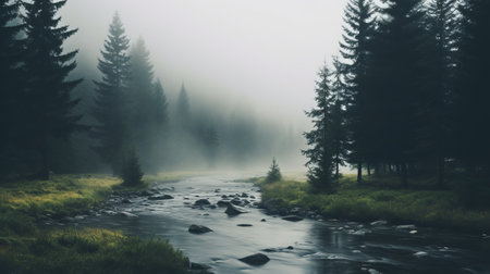 Experience the serene beauty of a mountain river flowing gently through a dense forest. Mist envelops the landscape, creating a tranquil atmosphere in nature.
