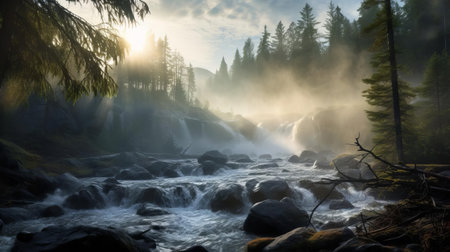 river, cascading through forest oasis, with mist rising from the water, created with generative ai