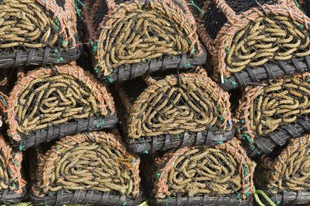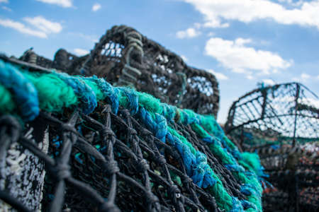 Closeup detail of lobster pots on a seaside harbor quayside