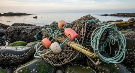 This close-up image showcases various fishing gear including colorful buoys and nets, arranged on a dock. The vibrant textures and marine elements capture the essence of fishing activity in a coastal setting.