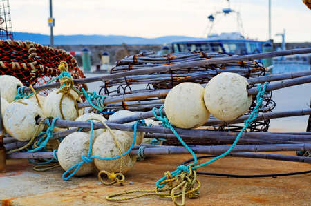Fishing nets and buoys stacked in plastic containers at the port (Pesaro, Italy, Europe)