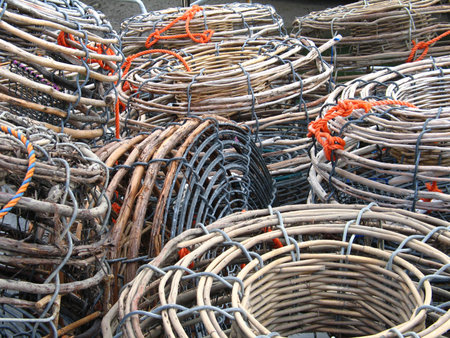 Lobster pots and traps stacked on a quay