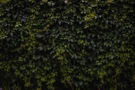 Green creeper leaves on the wall. Natural pattern, texture, green wallpaper. Wild vine leaf background. Liana on the fence, hedge. The concept of gardening.