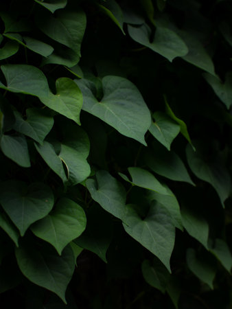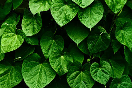 Dense heart-shaped green leaves of sweet potato vine or morning glory plant creating natural texture background