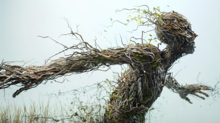 A sculpture that appears to be made entirely of branches and twigs bends and twists in the shape of a human form connecting nature and humanity in an abstract way