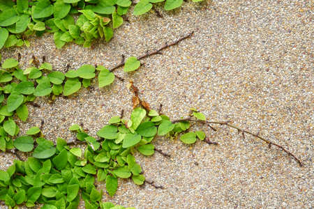 green leaves plant or tree growing and branch on concrete with sand wall or floor and ground for interior decor or nature exterior architecture and wallpaper background at home or hotel resort