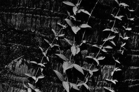 Black and white image of new leaves growing on old tree trunk with dark background. Nature in monochrome, Howrah, West Bengal, India.