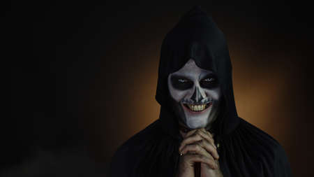 Dangerous man with skull makeup wearing a black robe with a hood stands in the moonlight against a gloomy background. Halloween. The devil, death.