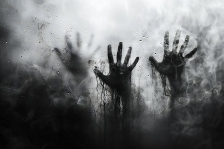 Halloween concept. Hands of zombies behind the wet window. Horror theme.