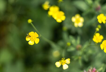 In a vibrant meadow yellow flowers of Potentilla reptans attract bees during a sunny afternoon creating a lively atmosphere filled with nature's beauty.