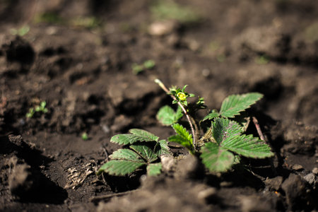 The birth of a young strawberry bush with green berries, the earth full of hope.