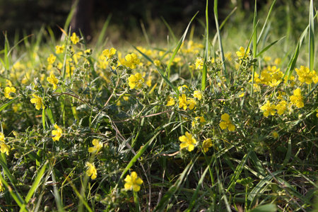 Vibrant yellow flowers of Potentilla reptans thrive in a sunlit meadow providing a habitat for bees and enhancing the natural beauty of the environment.