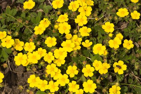 Cinquefoils or Potentilla. Blossoming flowers. Day light, sunny weather.