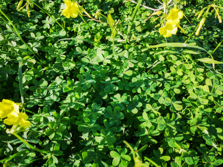 Most Beautiful Yellow Shamrocks Plant Flower on Green Leaves Background.