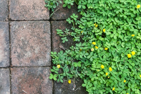 Colorful yellow flowers with green plant patterns growing through in concrete cracks floor background and space