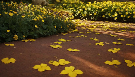 Yellow flowers in the garden with sunlight and shadow on the ground.