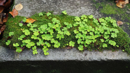 Moss-covered stone with a vibrant layer of fresh green leaves scattered around, forming a stunning organic pattern