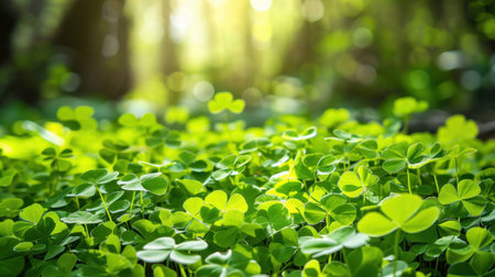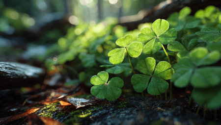 Close up view of green shamrocks thriving in sunlight on the forest floor, highlighting their vibrant color and texture, ideal for nature and holiday-themed projects