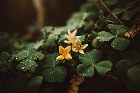 Close-up view of small yellow and white wildflowers nestled amongst a cluster of lush, green clover leaves. Water droplets are visible on the leaves, creating a sparkling effect. The image showcases the intricate details of the plants and their natural surroundings. A sense of tranquility and beauty is evoked.